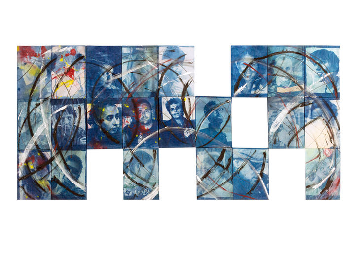 - Presences & Absences: polyptychs mounted following the same process that in the previous cases, evoking a childhood puzzles game. Two large pieces are made entirely of tiny portraits, some of which are empty and represent the absences and vacuums in memory. New figures and characters can occupy these same voids. The portraits and empty spaces appear as groupings of cyanotypes along with charcoal, lye and oil paint.